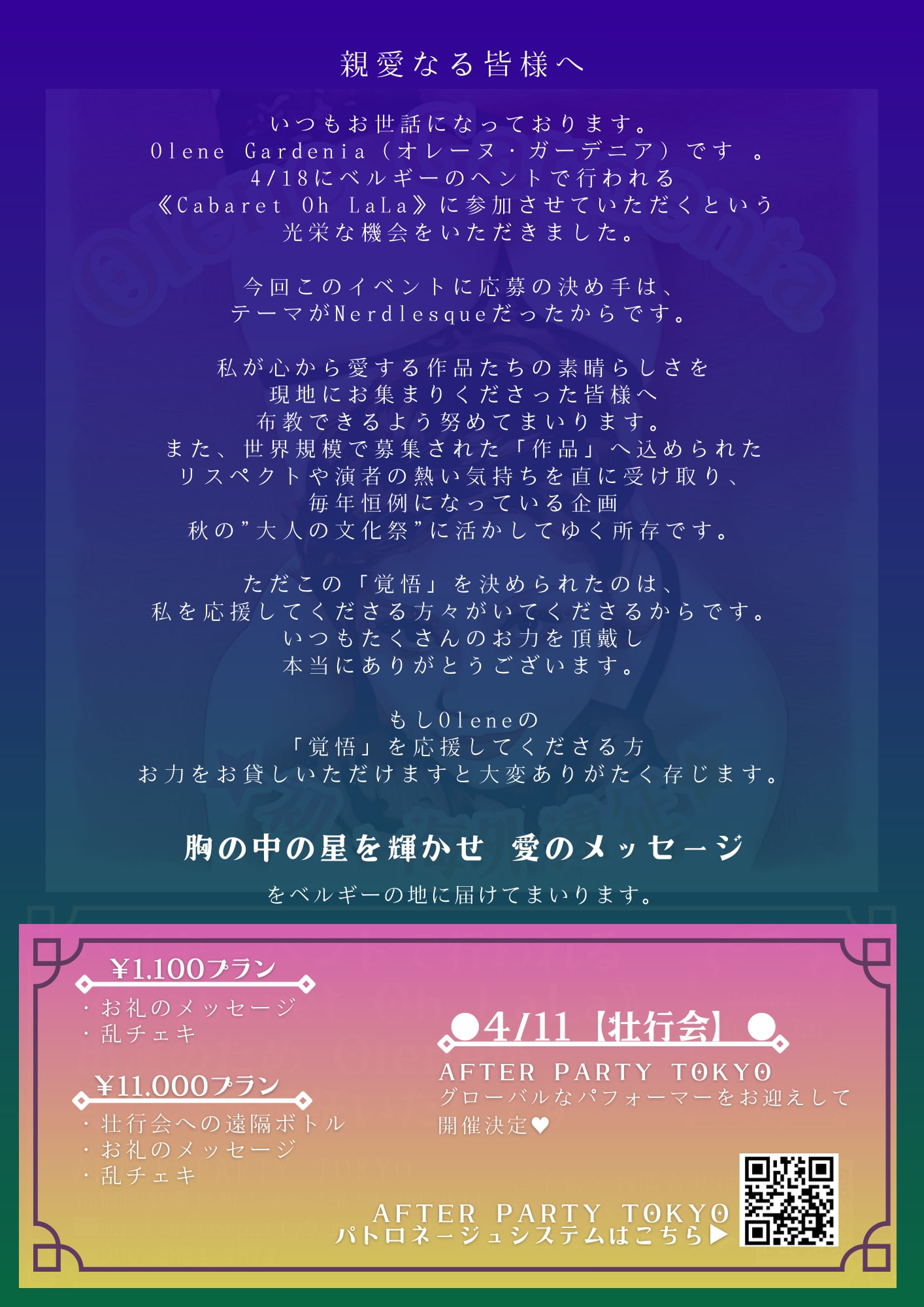 ご購入をいただけました場合は4/11の壮行会にボトルOPENをさせていただき、動画をお礼にお送りさせていただきます。